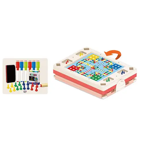 Kreativnim otrokom bo povsem sigurno všeč ta posebna risalna tabla, ki je imenitna ne le zaradi tega, ker se lahko zlahka iz nje napravi risalno stojalo, temveč tudi, ker se lahko v hipu na njej začne igrati družabna igra. Komplet se nahaja v plastični torbi z ročico, ki pa se lahko odpre z enim samim gibom in se lahko pritrdi tudi v stoječem stanju. V notranjosti škatle so tako koristne drobnarije, kot izbrisljivi barvni flomastri, goba ter na zadnji strani table izoblikovano družabno igro Človek, ne jezi se! potrebne figurice in metalna kocka.