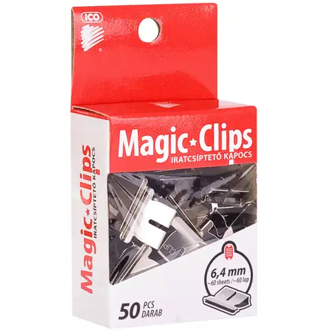 S pomočjo ICO Magic Clipper lahko zlahka, hitro in enostavno spnemo več papirjev. V tej škatlici je 50 sponk mere 6,4 milimetra, za spenjanje približno 60 listov. Največje prednosti sponk Magic Clipper je v spenjanju listov brez trajnih poškodb in se jih lahko kadarkoli odstrani ter pozneje ponovno uporabi.