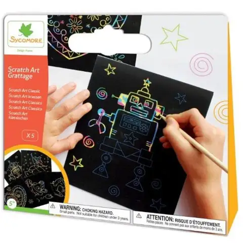 Paket s tehniko za izdelavo slik za praskanje Sycomore kreativnim otrokom ponuja popolnoma posebne možnosti za ustvarjanje. V paketu se nahaja list s petimi različnimi slikami, celotna površina katerih je črna, samo nekaj medlih pomožnih črt je, kar služi za pomoč malčkom. Naloga pa je le ta, da s pomočjo peresa za praskanje iz kompleta sledijo črtam in tako izpod črnega sloja odkrijejo barvno površino, tako bo postala vidna končna oblika risbe. Izdelava slik za praskanje razvija kreativnost, moč domišljije in tudi ročne spretnosti.