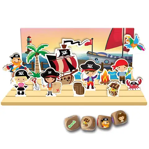 Pirati se ne zanimajo le za zaklade in boje, najmanj tako ljubijo namreč tudi posebne in razburljive zgodbe, glavni junaki katerih so slavni pirati, morski popotniki in seveda tudi zgodba veliko pripomore k takšni zgodbi. Meči s kocko in ti si lahko veliki pripovedovalec pristanišča, ki ga bodo mornarji poslušali z odprtimi usti. Igrača Tell-a-Tale je odlična izbira otrokom, s pomočjo pisanih figuric in ozadij lahko namreč izoblikujejo manjši oder, s štirimi kockami iz kompleta pa zgodbi dajo glavno nit. Igrača v veliki meri pripomore k verbalnemu izražanju in komunikacijskem razvoju otrok. Ker ni igralnih pravil, pripovedovanje zgodbe ni omejeno in otrokom daje velikansko svobodo.