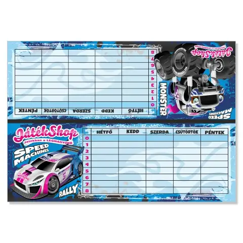 Resnično elegantni urnik, ki ti ponuja občutno več, kot kateri koli navadni urniki. Poleg tega, da je okrašen s slikami super dirkalnih avtomobilov, kot sta reli avto in Monster Truck, ti ponuja možnost vnašanja ur za dva različna tedenska programa, A in B. Med šolskimi urami bosta ti v veliko pomoč poštevanka in abeceda, kot tudi kotomer in ravnilo. Po zaključku učenja se pa lahko začne igra, s posebno Človek, ne jezi se! igro, katero napravijo posebno polja z bombami.