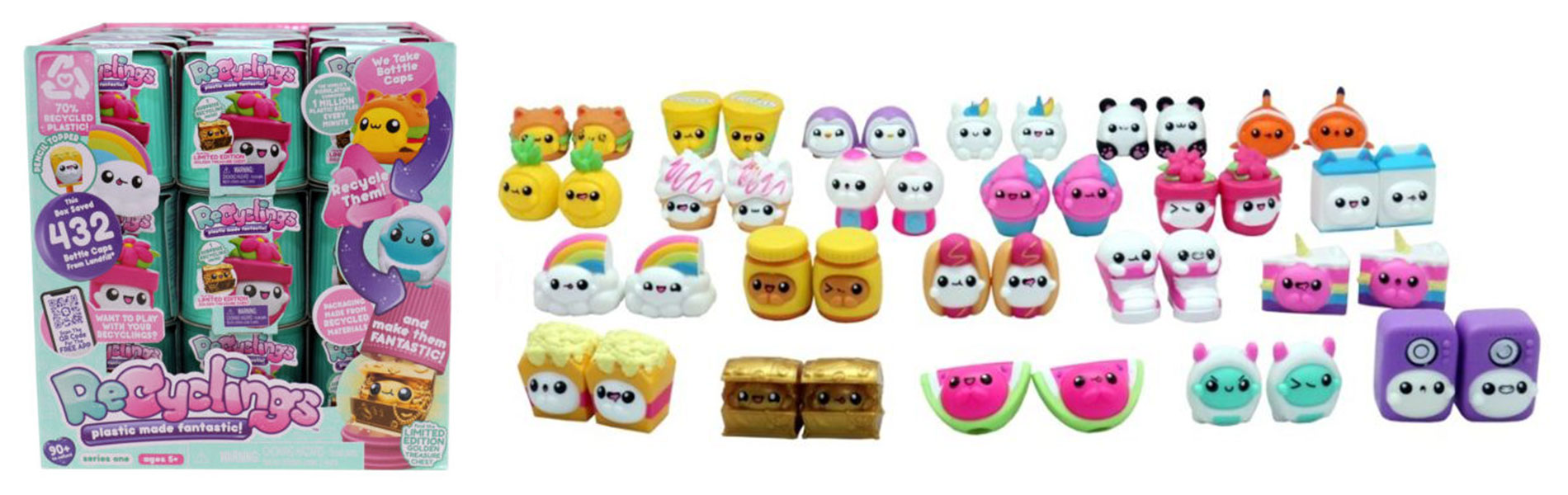 Od cmokov do zmajev, od Hotdogov do Handbagsov in od Popcornov do Pande, Recycles praznujejo svoja nova življenja, kar koli želijo. V prvi sezoni lahko otroci zberejo več kot 90 likov v osmih kategorijah, vključno s hrano, naravo, pod morjem, filmsko nočjo in drugo. Zbiralci lahko poiščejo tudi omejeno izdajo Recyclings - Glittery Shooting Star, Golden Treasure Chest ali Glowing Ghost -, da bo njihova zbirka še bolj vznemirljiva.