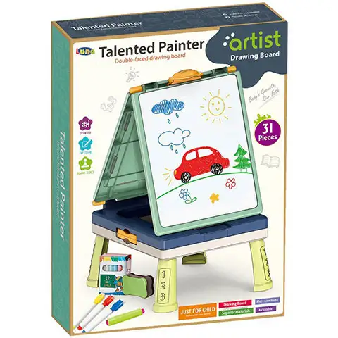Tako za potovanja kot domača ustvarjanja je popolna izbira ta risalna tabla, ki se jo lahko v hipu sestavi, da se že začne ustvarjalni proces ali pa napeta družabna igra. Komplet se nahaja v plastični torbi z ročico, ki pa se lahko odpre z enim samim gibom in se lahko pritrdi tudi v stoječem stanju. V notranjosti škatle so tako koristne drobnarije, kot izbrisljivi barvni flomastri, goba ter na zadnji strani table izoblikovano družabno igro Človek, ne jezi se! potrebne figurice in metalna kocka.