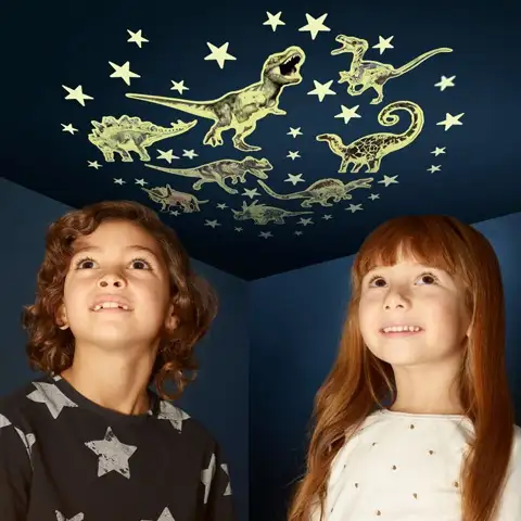 Vas muči, da zvečer ne vidite ničesar v temi? Potem popestrite sobo s temi super samolepilnimi plastičnimi nalepkami, ki svetijo v temi. V paketu najdete skupaj 35 zvezd in različne dinozavre, ki jih lahko po želji nalepite na steno ali strop. Zahvaljujoč posebnemu fosforescentnemu materialu bodo po ugasnjeni luči zvezde in dinozavri svetili v temi z medlo svetlobo in tako se lahko izvrstno uporabijo kot orientacijske točke.